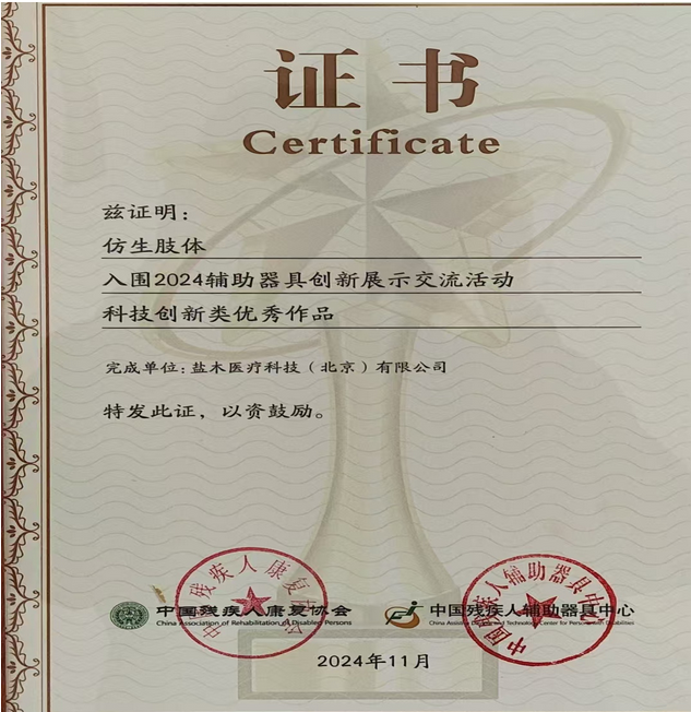2024年11月30日,中国国际福祉博览会暨中国国际康复博览会圆满落幕,盐木医疗科技仿生肢体凭借科技改变生活的核心理念,在辅助器具创新展示交流活动中大放异彩,成功入围科技创新类优秀作品。